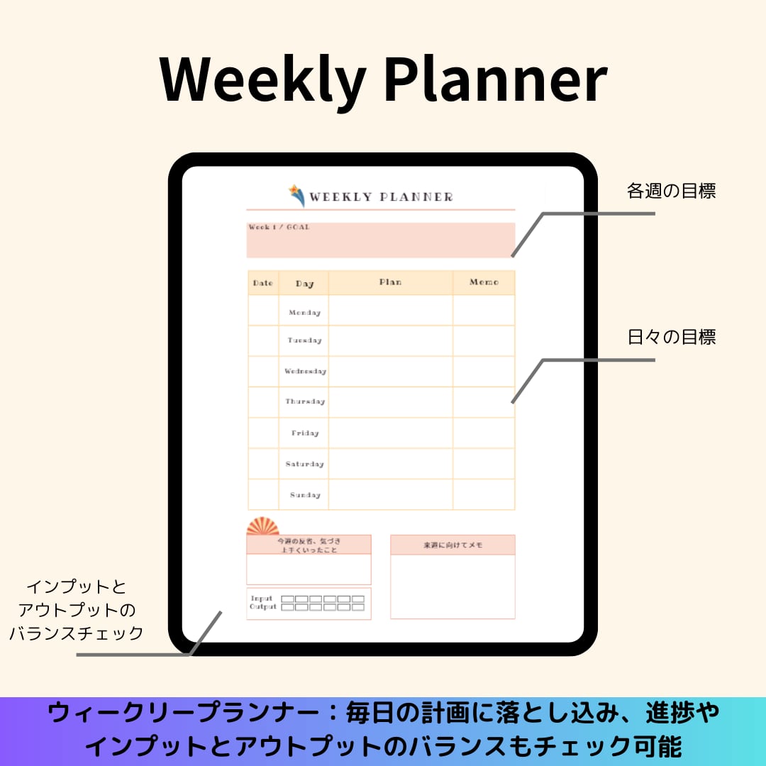 iPadのようなタブレットを使い、デジタルに日々のスケジュールやタスク、目標を設定・管理し、あなたの夢や目標実現に役立ってくれる相棒です。(利用するためには、iPadのようなデバイスと、スタイラスペン、そしてデジタルプランナーを実際に使うためのノートアプリ(例:Goodnotes / Noteshelf など) が必要です。この3つはご自身でご準備ください。)商品のご提供は、PDFデータにてさせていただきます。データを紙印刷し、物理的なシート形式で利用することも可能です。